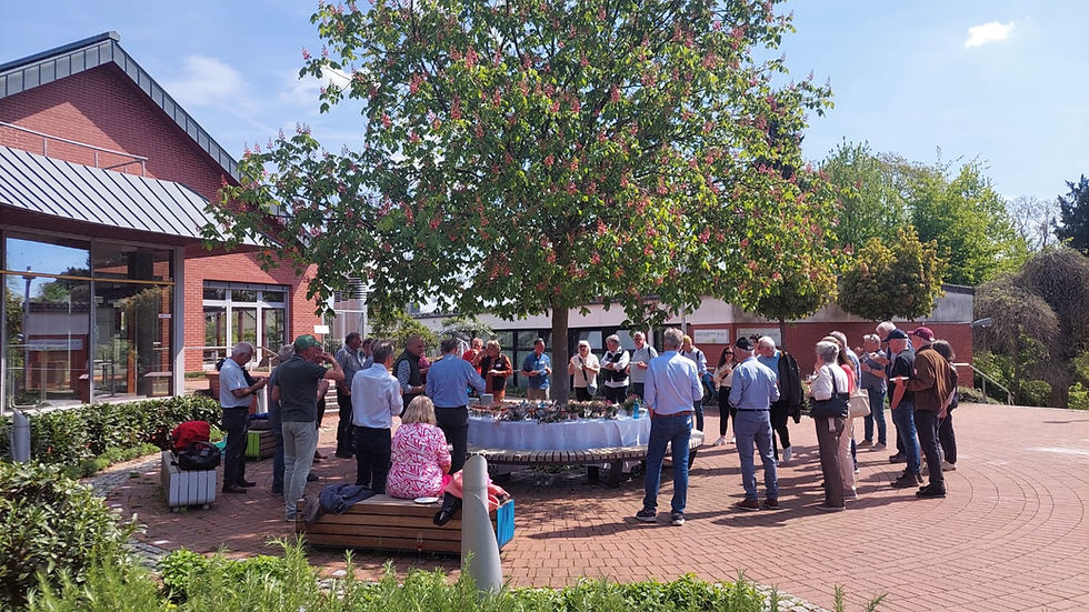 Zurück auf dem Campus empfing Alumni-Referentin Karina Klotz die Gäste bei strahlendem Frühlingswetter zu einem Sektempfang unter freiem Himmel – ermöglicht mit freundlicher Unterstützung der VEG Geisenheim Alumni Association.